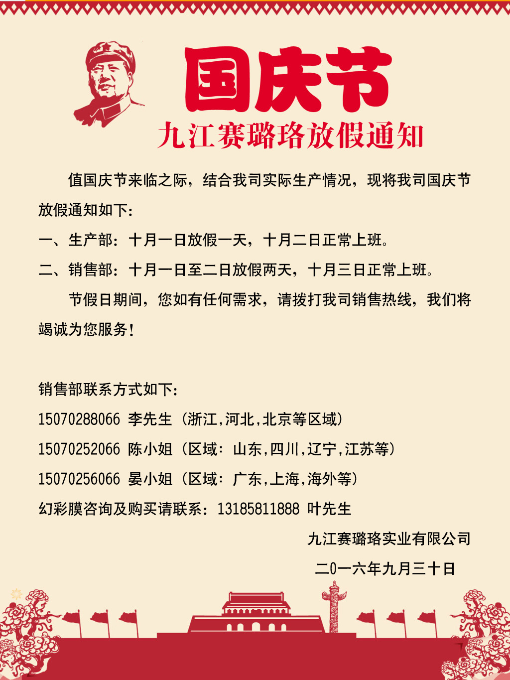 值國慶節來臨之際,結合我司實際生產情況,現將我司國慶節放假通知如下: