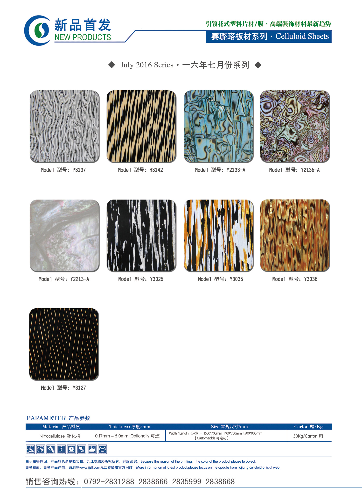 九江賽璐珞實業(yè)有限公司2016年七月份賽璐珞板材、瑪瑙膜、理石膜、樂器裝飾材料、花式PVC片材新品發(fā)布,引領(lǐng)花式塑料片材/膜·高端裝飾材料最新趨勢。咨詢熱線:0792-2838668 / 2838666 / 2835999。